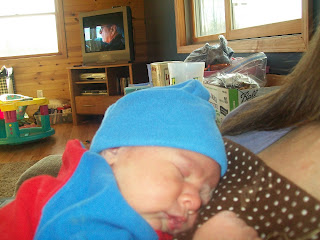 Here is a picture of my little ones cuddling. That’s me sitting in the rocking chair…having some strong contractions. Sethie was reading to Dessie while she watched the video.